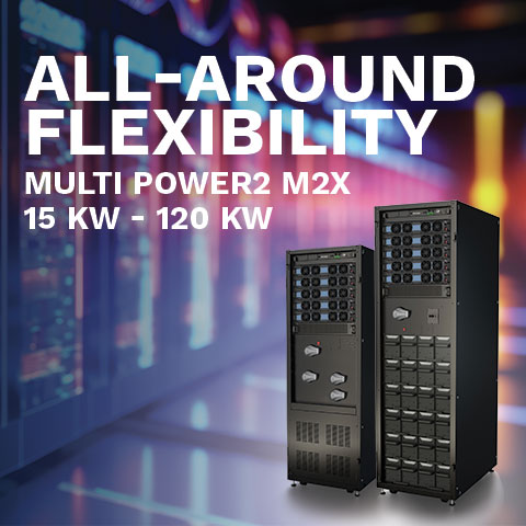 Riello UPS presents Multi Power2 M2X, the new generation of modular ON LINE Double Conversion UPS designed to guarantee continuity, flexibility and high energy efficiency in small data centres and critical applications.